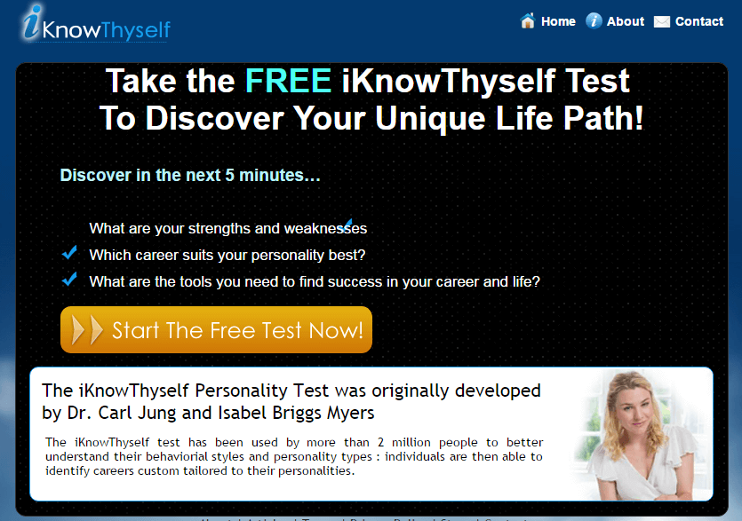 The guide of iKnowThyself by Melanie Calkins uses a well-known method of personality evaluation calledMyersBriggs Type Indicator to help the customer in building up their own self-knowledge. TheMyersBriggs Type Indicatordifferentiates 16 different types of personalities based on how people interact with their environment, how they make decisions and how they act. In her guide,Melanie Calkins then deduces a so called Brilliance Code for each of the 16 personality types, which is a combination of skills, knowledge and naturalaptitudes to help the reader in making the best decisions in life.