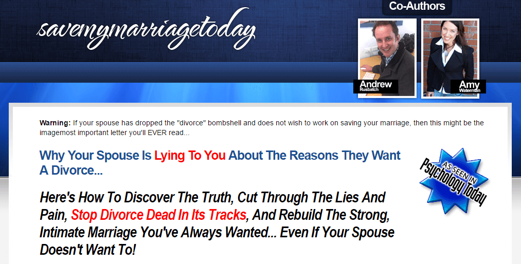 Save My Marriage Today is an interested eBook by Amy Waterman and Andrew Rusbatch who are both experts in the field of marriage and relationships and has helped thousands of couples all over the world. As the name suggest, this eBook was designed to provide you the help you need to enjoy a happy long lasting marriage regardless of if you are experiences minor problems or the type of problems that will eventually lead to divorce.